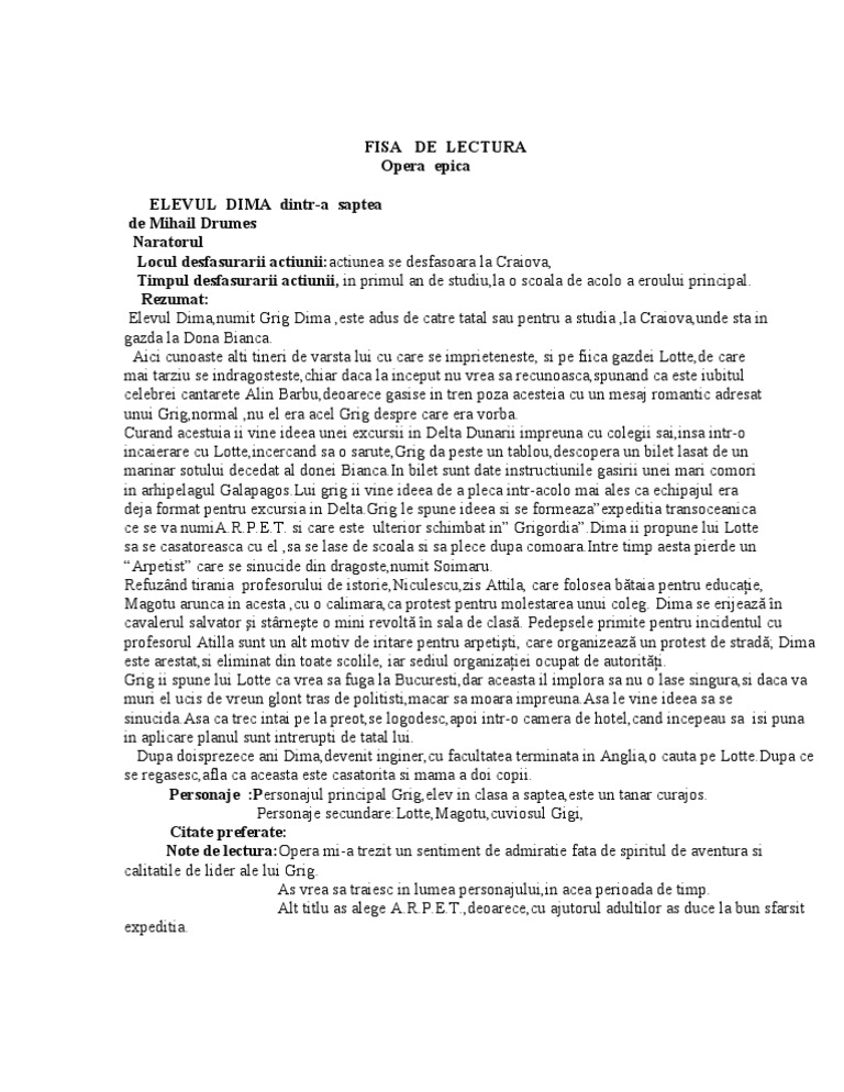 Fisa De Lectura Elevul Dima Dintr A Saptea